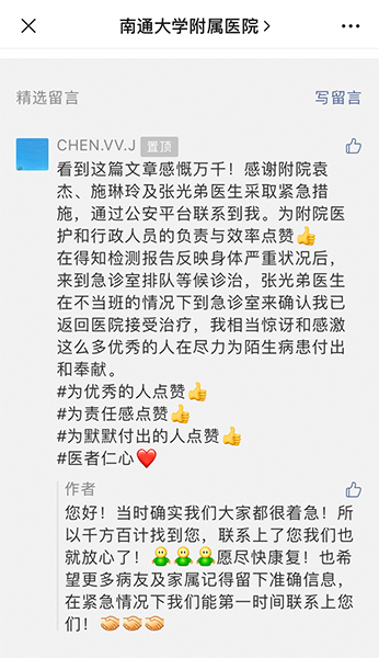 现代快报讯 (通讯员 谢星宇 记者 花宇)“感谢附院袁杰、施琳玲及张光第医生采取紧急措施,通过公安平台联系到我。为附院医护和行政人员的负责与效率点赞!在得知检测报告反映身体严重状况后,来到急诊室排队等候诊治,张光第医生在不当班的情况下到急诊室来确认我已返回医院接受治疗,我相当惊讶和感激这么多优秀的人在尽力为陌生病患付出和奉献。”6月19日晚,南通大学附属医院微信公众号推送的一篇文章下出现了一条暖心留言。现代快报记者了解到,留言者陈女士在通大附院检测的谷丙转氨酶超过1600U/L,急需回院处置,可陈女士留错了联系方式。通大附院的医生们多途径查找,仅用四十分钟就找到了这位“粗心”的陈女士,化解了危机。