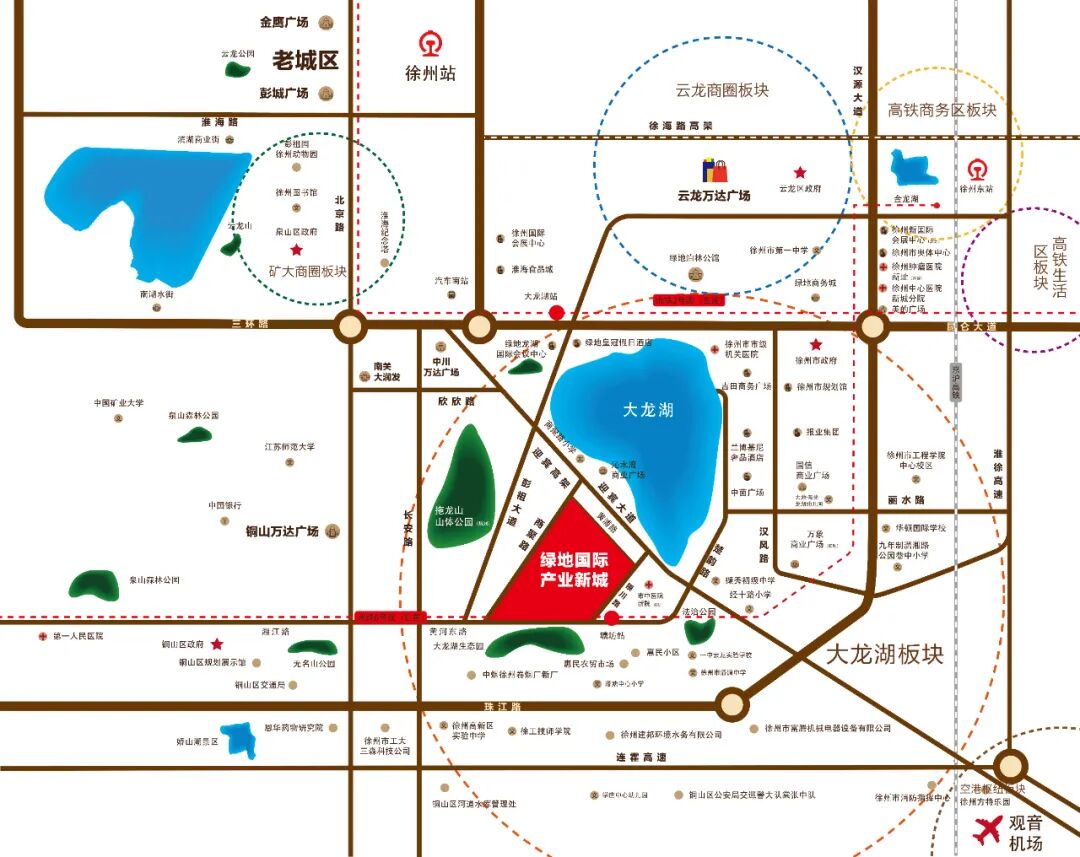 绿地国际产业新城位于大龙湖南侧,是徐州市重点打造的淮海经济区检验检测产业集聚区未来将打造成为新兴科技产业产城融合示范区。