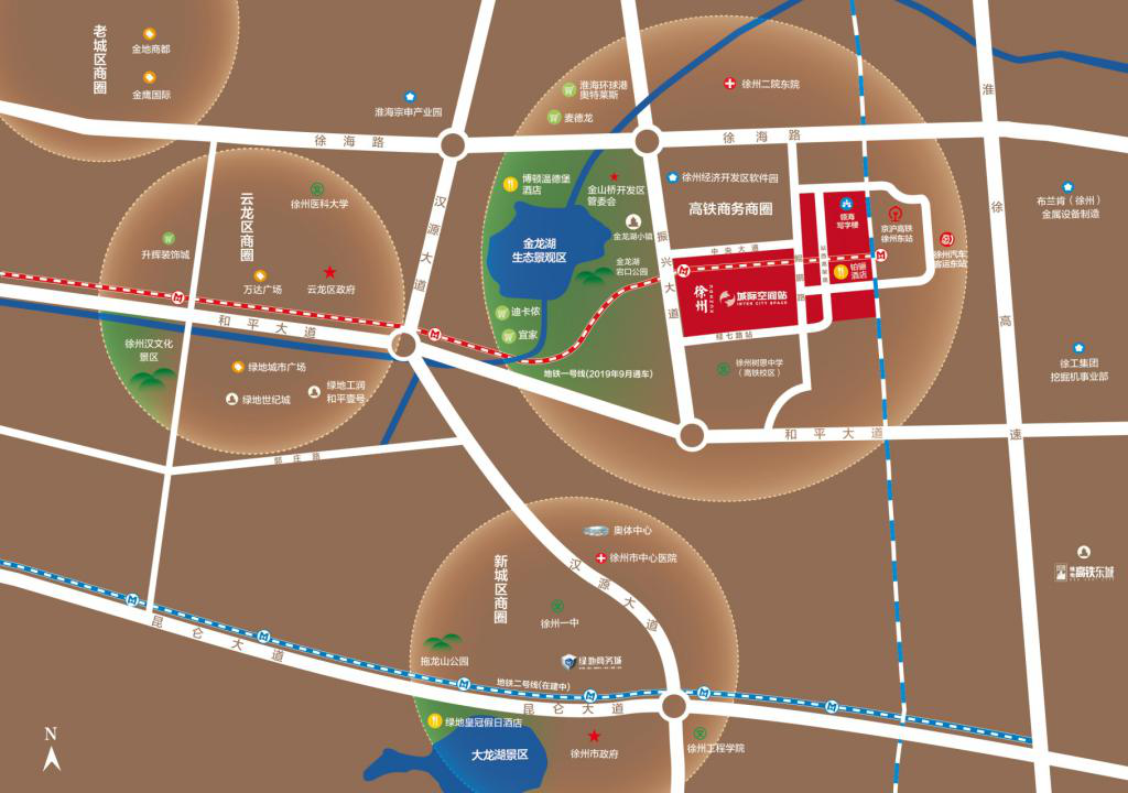 位于淮海经济区中心城市徐州的新城区南部,与徐州老城区、高新技术开发区、经济技术开发区互成犄角之势,相距均在10km 范围内,区位条件优越,交通设施完善。距离市政府约4公里,距离徐州东站和徐州站均10公里,距离徐州观音机场30公里。