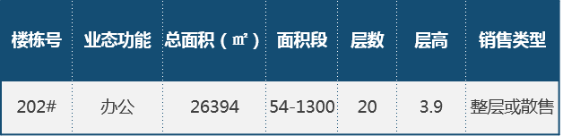 项目在售202#的办公产品,共计20层,层高约3.9米,总面积约26394㎡,价格约7000元/㎡。