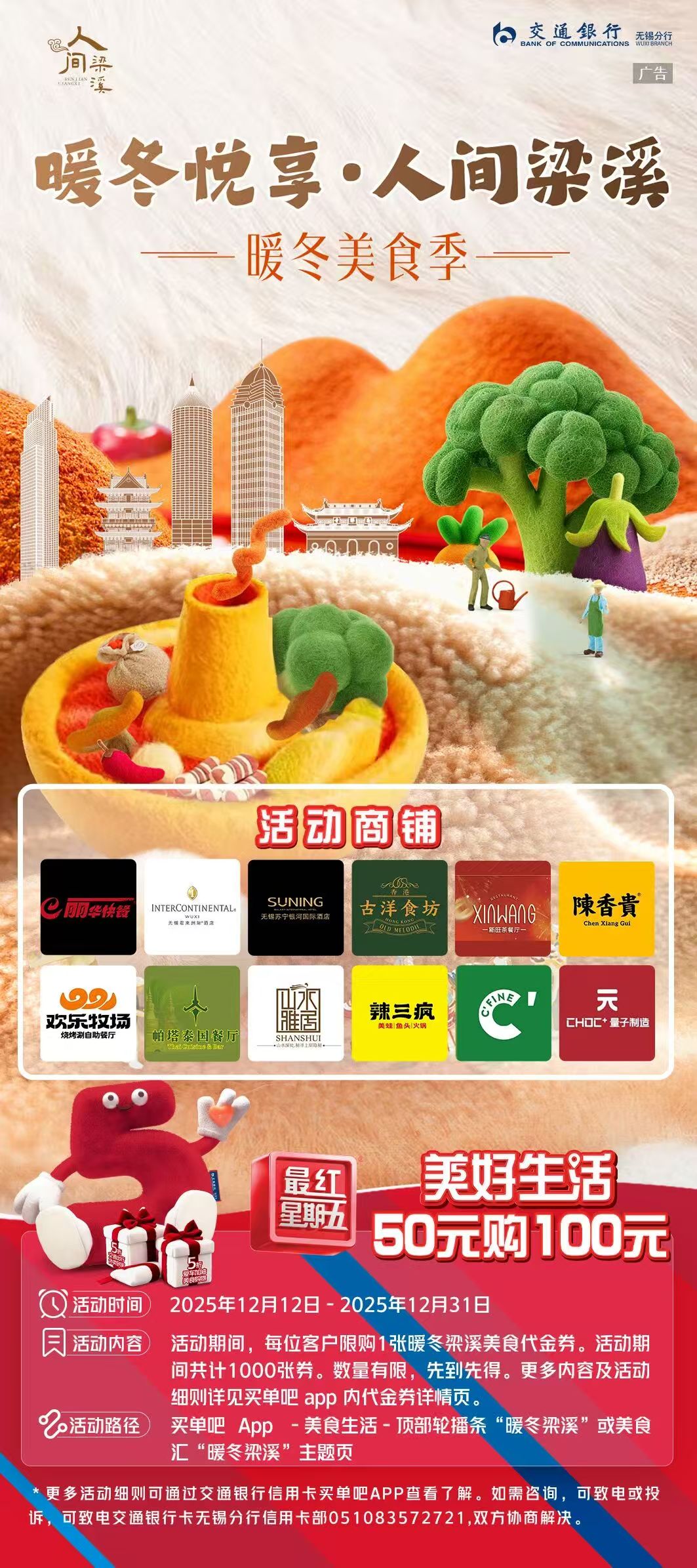 交通银行无锡分行始终秉持“惠民利民”的服务宗旨,通过整合本地优质商业资源,在“暖冬消费季”将金融服务深度融入消费场景,以实际行动助力无锡消费市场升温。消费者登录交通银行“买单吧APP”,可一键获取各类消费券与活动信息,轻松玩转暖冬消费全场景。