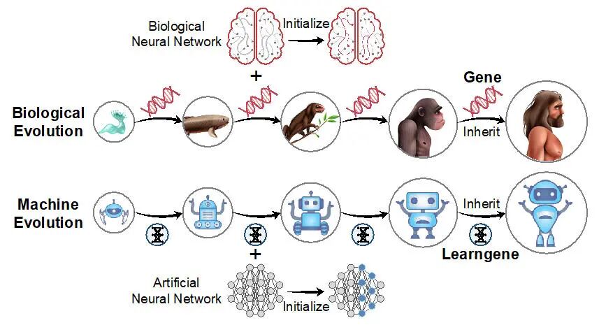 人工智能的发展一直深受生物智能的启发。生物体通过基因在代际间传递知识,赋予后代以先天能力,而现有的人工智能却始终缺少类似机制。人类和动物的大脑在出生时已被进化了35亿年的基因“蓝图”所初始化,而机器往往只能依赖海量数据,从零开始进行低效的学习。