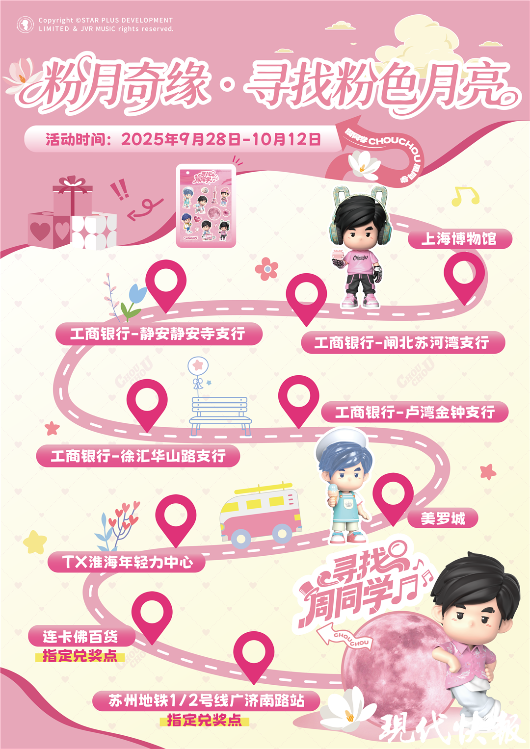 第二重惊喜:周同学官方IP互动空间。即日起至10月31日,在苏州地铁1/2号线换乘站广济南路站、苏州地铁11号线花桥站联名“周同学”官方IP,打造“寻找周同学”沉浸式互动空间,营造粉色潮流世界。