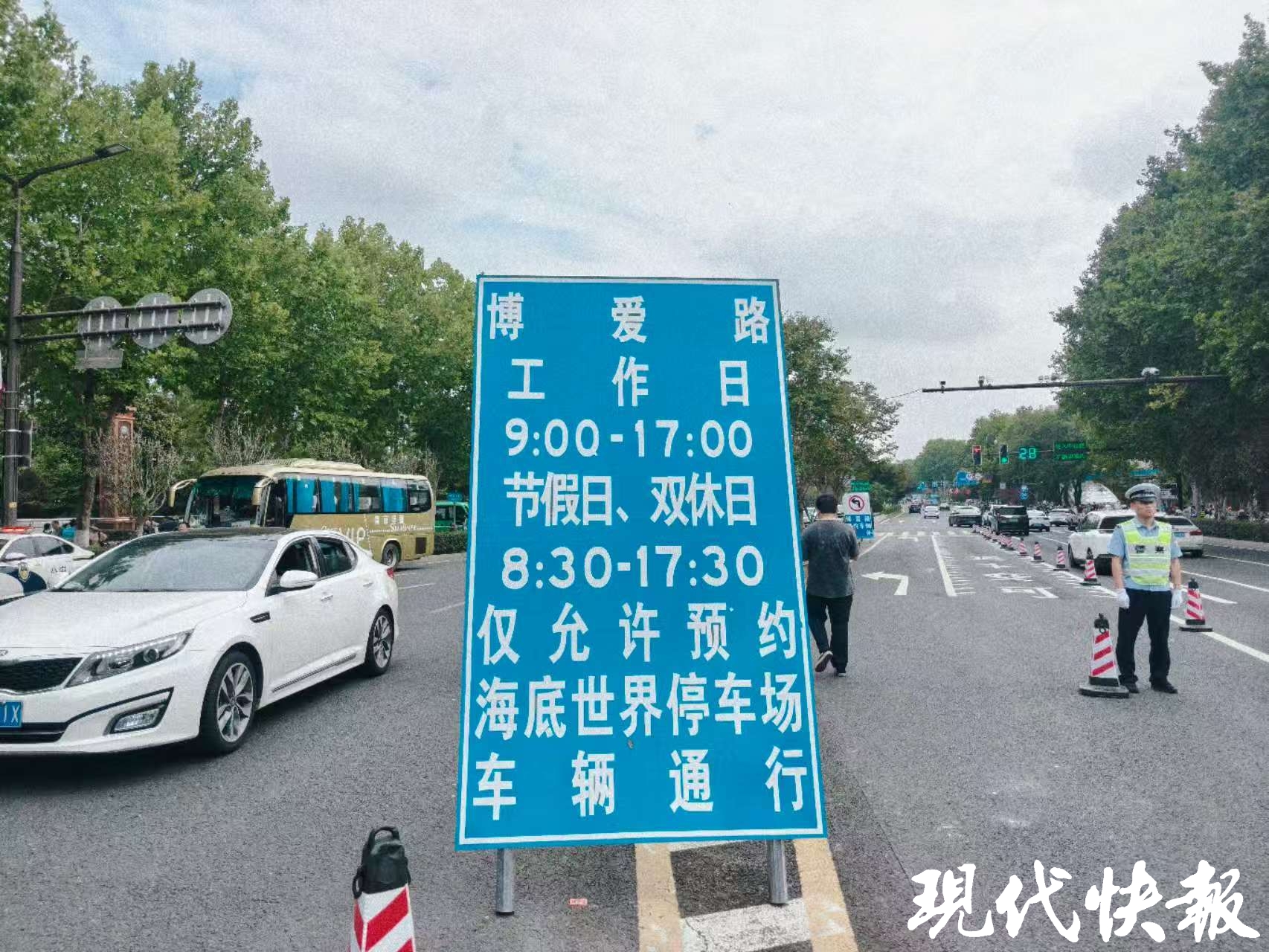“博爱路工作日9:00—17:00,节假日、双休日8:30—17:30仅允许预约海底世界停车场车辆通行。”上午的中山门大街车流涌动,在博爱路路口竖立着多块这样的大型落地指示牌。