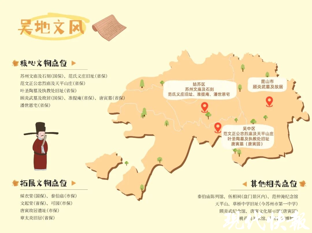 阡陌丰粮仓,地灵育人杰。千年吴地文脉绵长,孕育了以士大夫精神为核心的人文传统。沉浸其中,感受吴地文风如何以“先忧后乐”的胸怀、“经世致用”的担当和“崇文重教”的传承,熔铸成一种刚柔并济的家国情怀。游径从泰伯南迁起笔,串联起府学、园林与宅第,跟随韦应物、范仲淹、顾炎武、叶圣陶等贤哲的足迹,展现江南“崇文重教”的传统与精神升华的历程。苏州的一碑一刻、一庙一院,无不静静诉说着吴地文风的千年传承。游径串起承载吴文化源流与教育传统的重要遗存,从泰伯奔吴的起源到宋明文化的昌盛,再到清代科举的极峰,清晰勾勒出一条吴地文脉演进的轨迹,也展现出苏州作为“江南文心”的深厚底蕴。在这条文脉悠长的河流中,苏州走出了无数仁人志士,延续着从经世济民到文化传薪的精神火炬。行走其间,领略江南文脉的源头活水,感受“天下兴亡,匹夫有责”的赤子担当,体会近现代知识分子匡时济世的胸怀与隐逸高洁的风骨境界。在四大宋碑前感受千年儒风,体验碑刻拓印,亲手触碰历史的温度,在范文正公忠烈庙及天平山庄瞻仰“先忧后乐”的士大夫精神,在红叶清泉间诵读《岳阳楼记》,在潘世恩宅(苏州状元博物馆)探秘“贵潘”世家的百年文脉,透过建筑与展览感受“一门九进士”的科举传奇。
