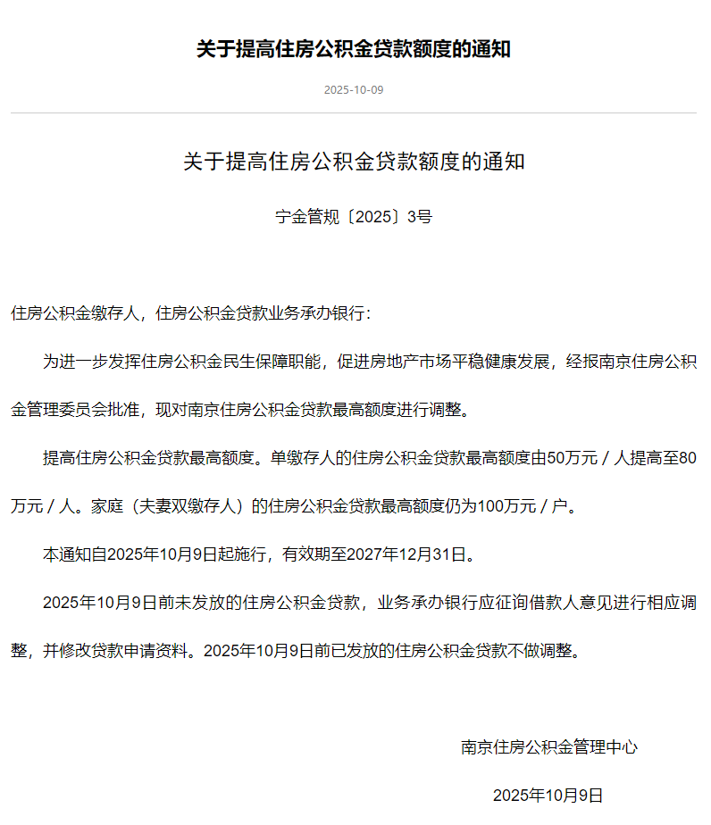现代快报讯(记者 杨晓冬)10月9日,南京公积金发布消息,提高住房公积金贷款最高额度。现代快报记者注意到,本次住房公积金贷款额度调整主要针对单缴存人,最高额度从50万元/人提高至80万元/人。本次调整自2025年10月9日起施行,有效期至2027年12月31日。