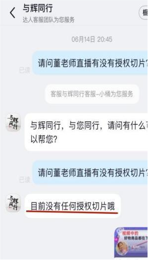 “直播切片”行业存在两类账号,一类是授权账号,另一类是未授权账号。目前,也有不少主播并未开放直播切片授权。体验调查发现,与辉同行、东方甄选、刘媛媛等直播间目前均未开放直播切片授权。此外,交个朋友直播间官方客服表示,直播切片目前已暂停授权,后续还没有通知。