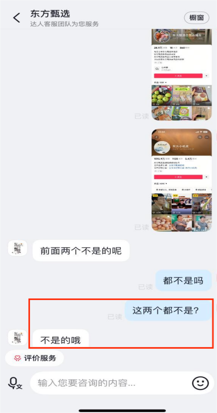 体验员以某知名直播间名称为关键词搜索,检索到多个名称带有相关字样的账号,其中部分账号有公司名称或者“蓝V”标识,部分账号采用统一头像或背景图。体验员将部分账号向该直播间的官方客服求证,客服表示官方账号的头像与背景图一致,且橱窗中的产品来自直播间官方店铺。“东方甄选自营品推荐”“东方小机灵”两个账号经客服确认,虽然名称相似,但是非官方账号或官方授权账号。