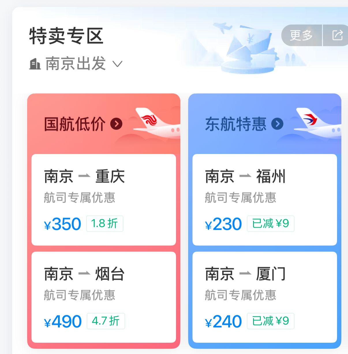 现代快报讯(记者 刘伟娟)国庆中秋双节假期落幕后,全国各地机票开启“断崖式”下跌模式。10月14日,现代快报记者从第三方售票平台获悉,从南京、上海、昆明、合肥等地出发的多条航线,票价两三百元的机票频现,部分热门旅游城市票价跌破200元。出境游航线也同步降价,为错峰出游的旅客提供了好时机。