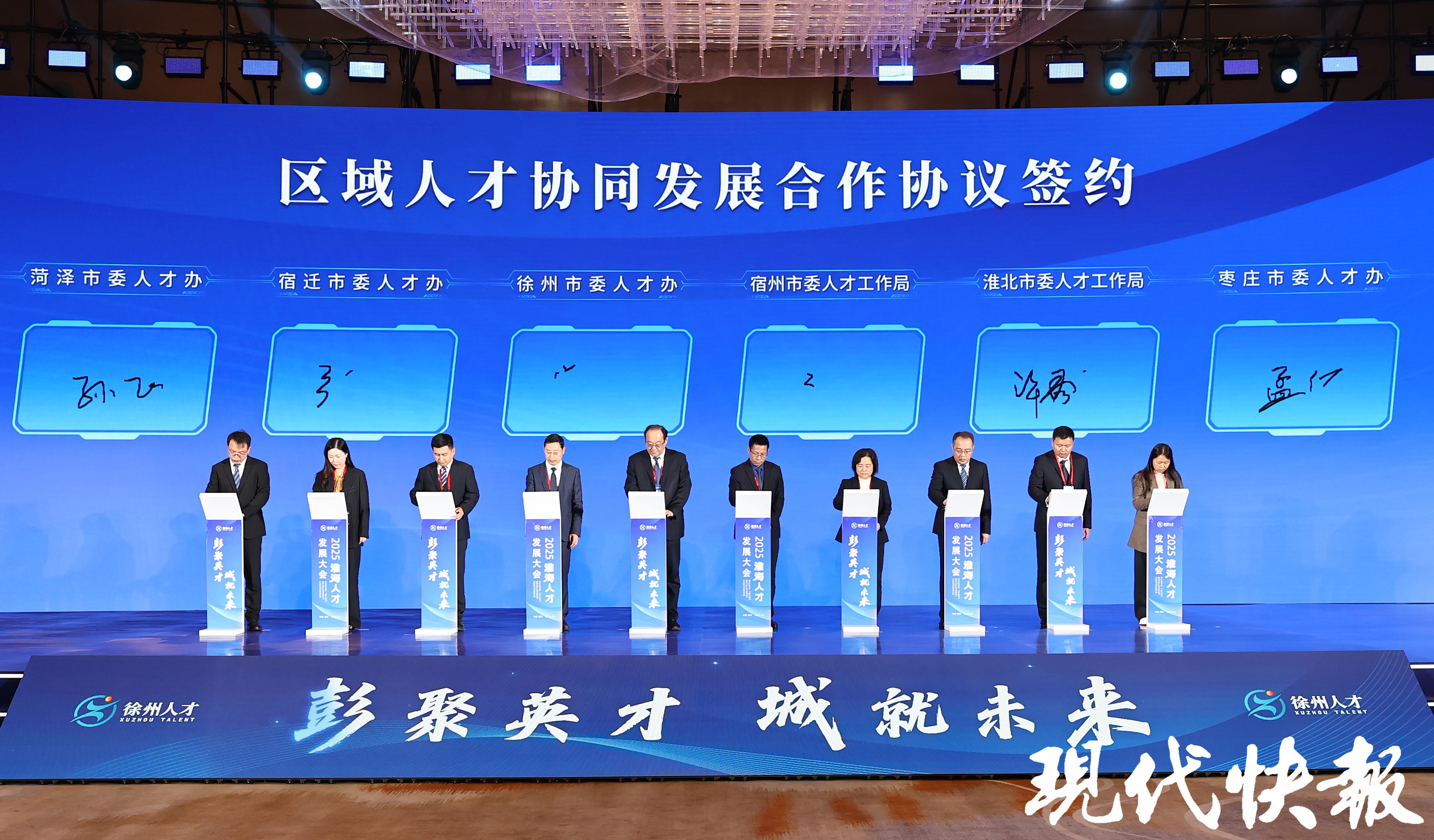 大会上,徐州市双创团队和人才代表获颁项目资助,全国职业技能大赛获奖选手、优秀教练获得奖励,徐州市产业骨干人才培养对象荣获证书。徐州数字文化产业人才政策、江苏徐州新兴产业专项母基金发布,省未来产业技术研究院授牌,徐州人才商学院揭牌成立,苏皖鲁豫省际交界地区10市签订人才协同发展合作框架协议。