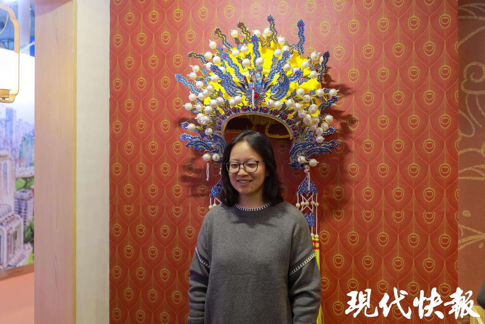 “侬快点啊,来拍一张”“一二三笑!”最热门的打卡区要属巨大的“凤冠”装置,站在“凤冠”下,仿佛头戴凤冠,一秒变身舞台上的角儿。观众们纷纷打卡,留下靓丽的“角色照片”。