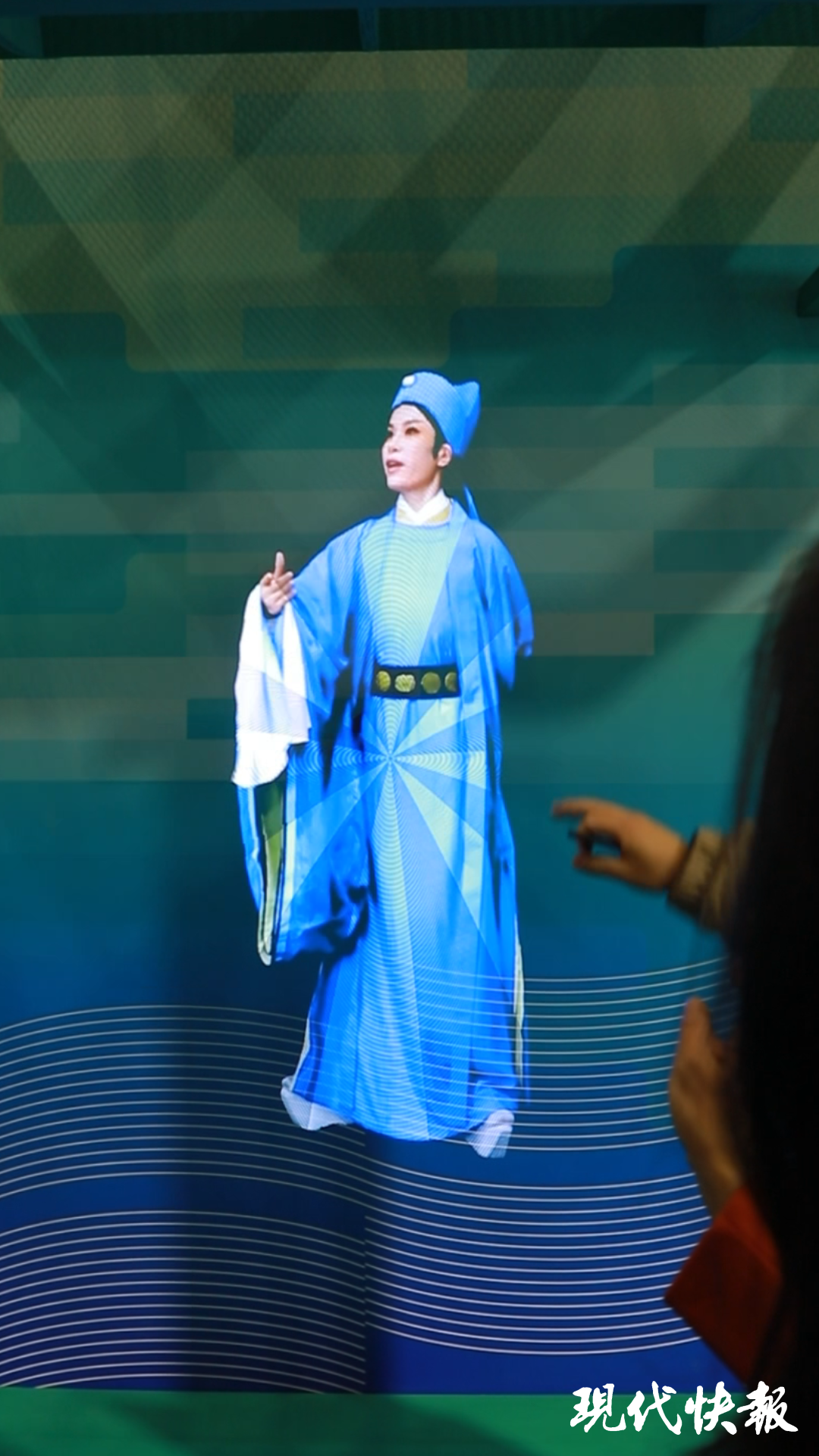 《柳毅传书》《梁祝》《红楼梦》……经典的越剧选段的人物被投影在扇形旋转投影屏上,如光影风车转动,裸眼3D效果让演员的一颦一笑都突破屏幕束缚。