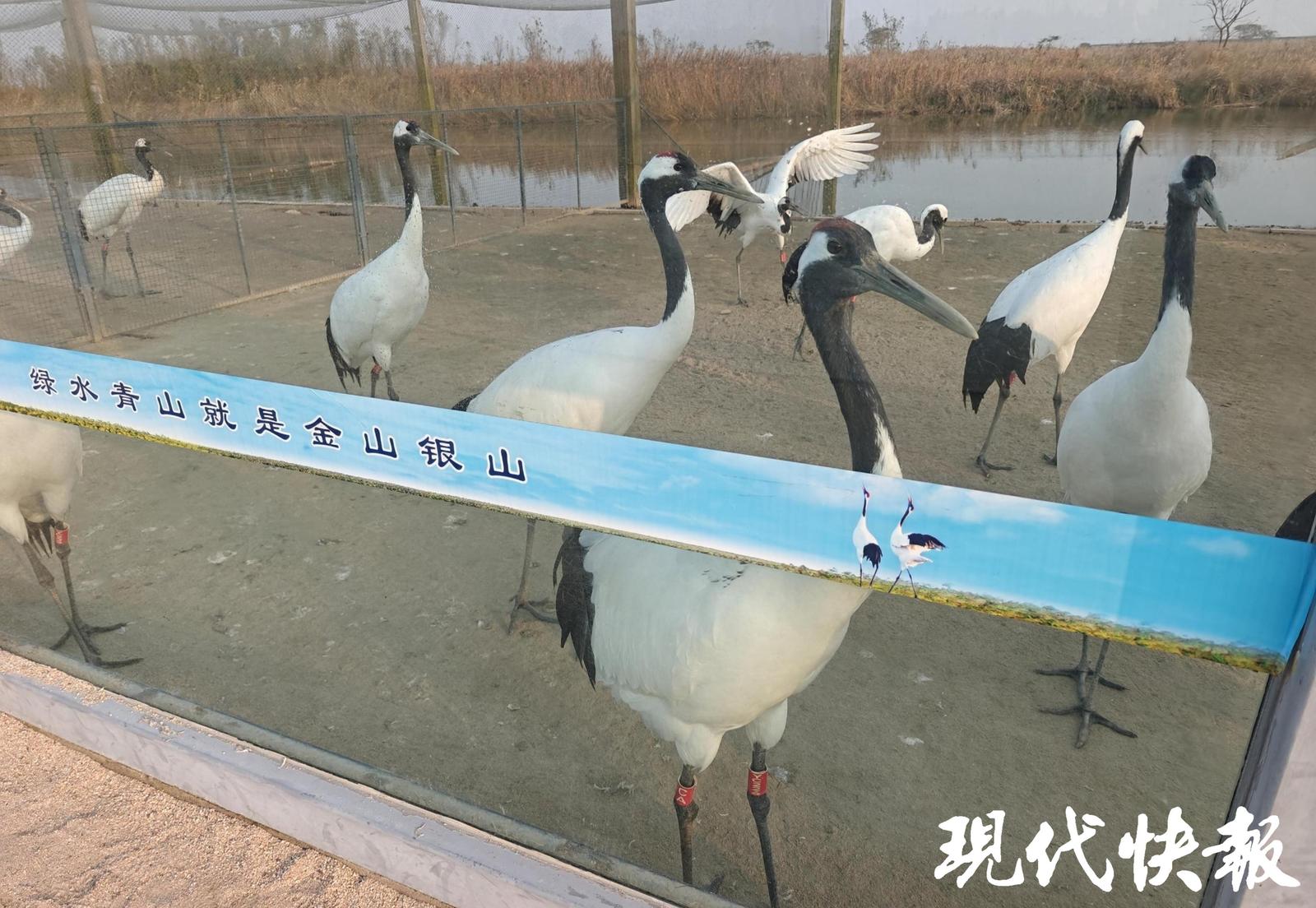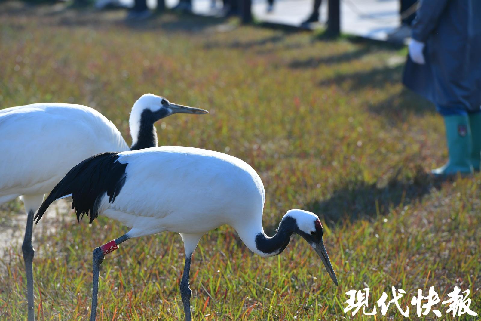 在保护区内的丹顶鹤繁育中心,几只丹顶鹤在草坪上悠闲踱步,优雅中透着呆萌可爱,引得中美学生纷纷拍照记录。现场根据丹顶鹤的年龄、发育阶段设置了不同的笼舍,还有东方白鹳、灰鹤等珍稀鸟类。其中,作为中美友好交流的小使者,明星丹顶鹤“加利福尼亚”吸引了众人围观。