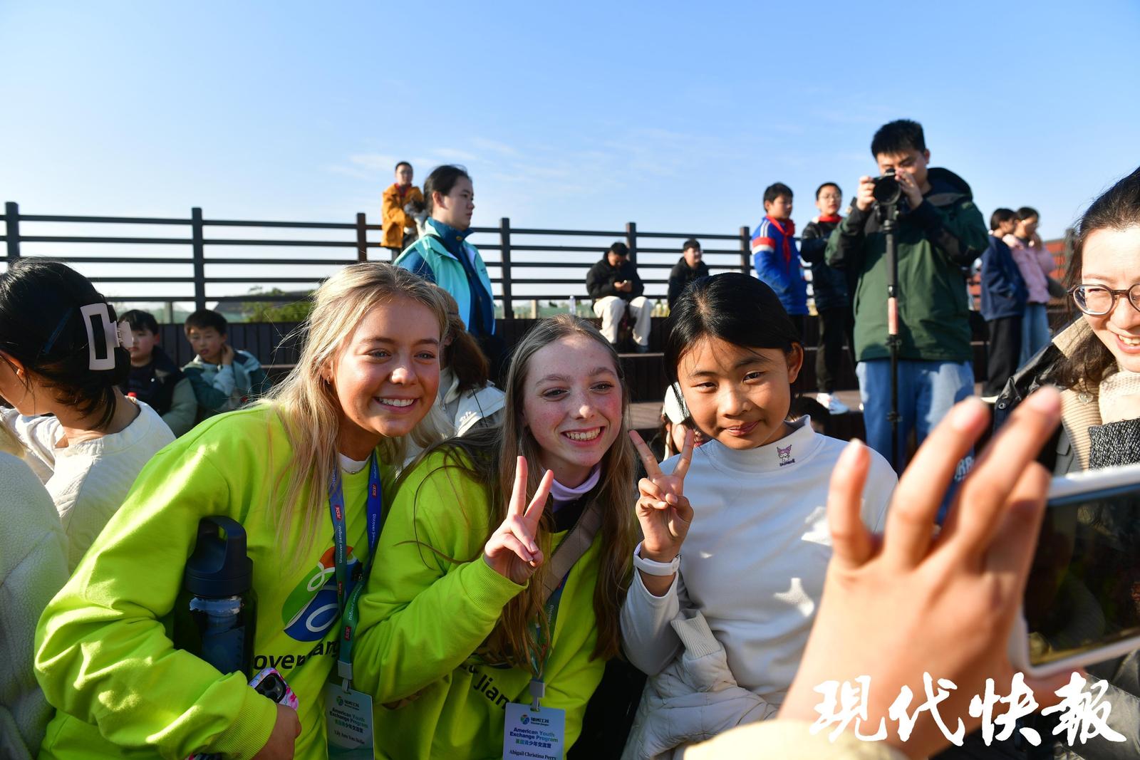 “你们是来自美国的吗?”“我们可以一起拍照合影吗?”在活动现场,麦克尼古拉斯高中师生还偶遇了一群热情活泼的当地小学生,双方迅速开启了“社牛”模式——互相亲切互动、拍照合影,彼此用简单的中文和英文问候,笑声不断。临走时,不少盐城的小学生将自己收集的梧桐树叶送给远道而来的美国客人,场面温馨而欢乐。