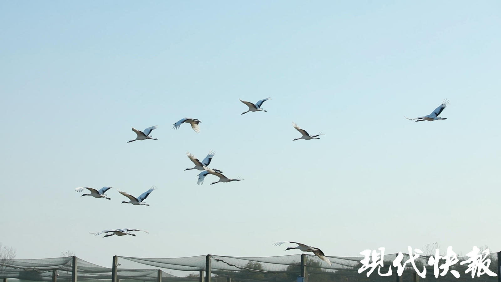 在采风活动中,最令中美青少年期待的便是放飞丹顶鹤的环节。当丹顶鹤繁育中心工作人员打开笼舍门,小家伙们一个个拍翅而出,展开双翼振翅高飞,在空中划出优雅的弧线,场面十分壮观,让现场的学生们惊叹不已。