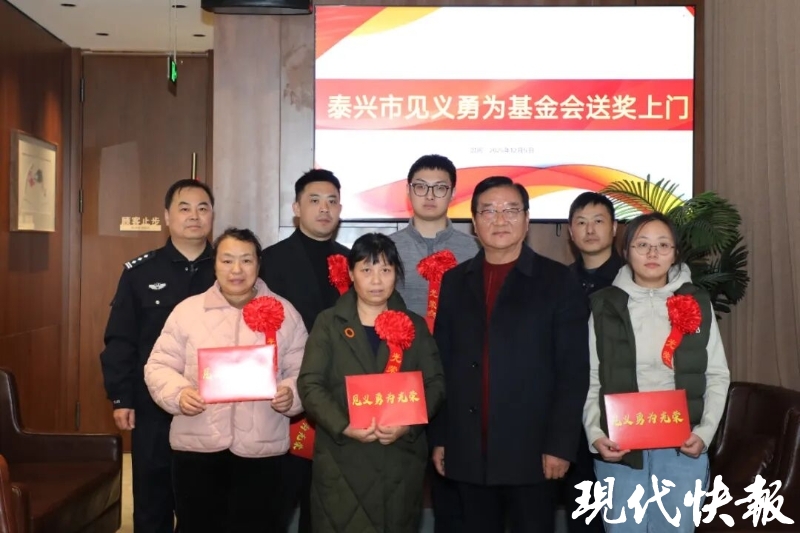现代快报讯(通讯员 胡帅 戴杰 记者 刘媛)12月5日下午,泰州泰兴市见义勇为基金会在泰兴桐竹园早茶运河店举行送奖上门活动,为在紧急关头伸出援手的5位热心市民钱洋、赵敬文、成艺、周爱霞、褚爱平颁发见义勇为奖励,表彰他们的善行义举和高尚品德。