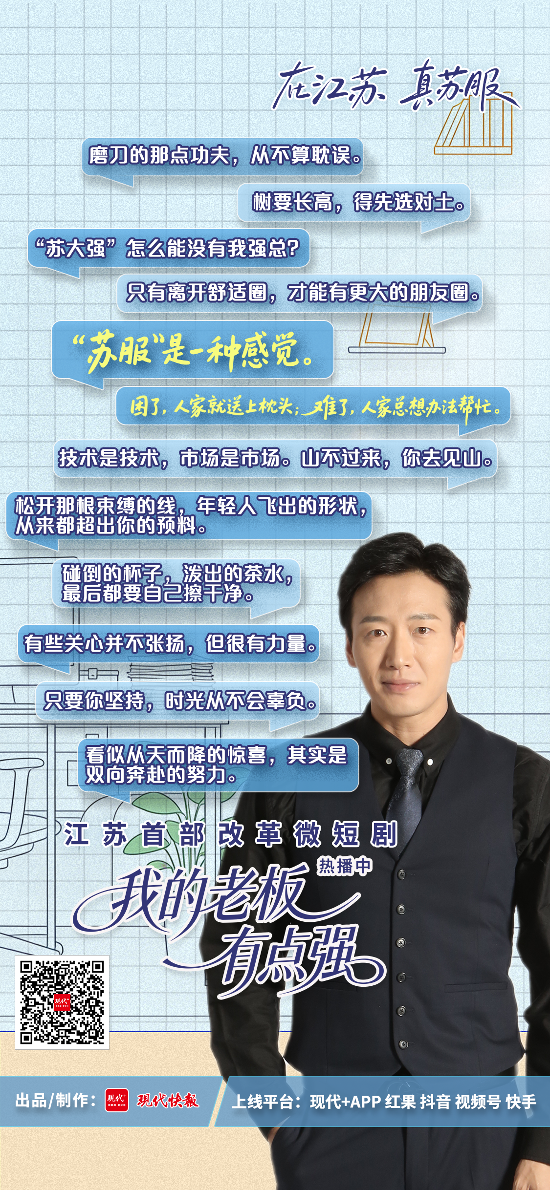 凭借“苏大强怎么能没有我强总?”的豪迈宣言,海归博士强毅带领团队扎根江苏,开启了创业之路。近日,江苏首部改革微短剧《我的老板有点强》在现代+APP、红果、抖音、视频号、快手等平台热播,红果热度1000万+,微博话题#在江苏真苏服#、#我的老板有点强#累计阅读量超2000万。这部由现代快报出品并制作的微短剧,上线后就吸引了不少“自来水”观众。有园区企业服务专员直呼“共鸣”,还有政府部门相关人员也点赞,称短剧把江苏的改革举措讲得明明白白,真正用身边小故事讲述了改革大道理。
