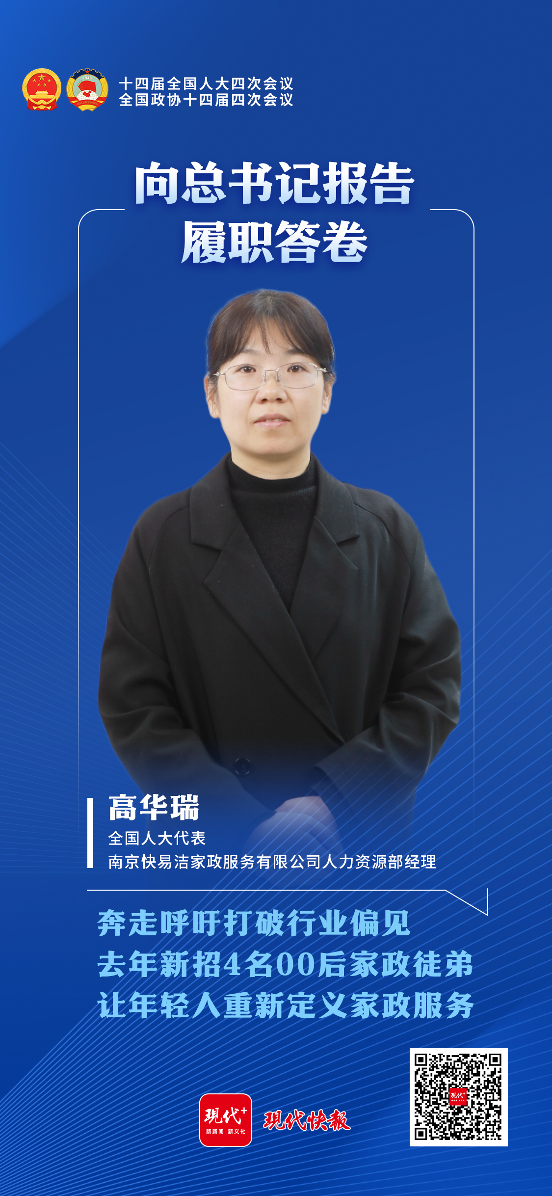 “2025年,我们来了4个00后!”谈及家政行业的新变化,全国人大代表、南京快易洁家政服务有限公司人力资源部经理高华瑞的语气里满是激动。2月25日,在接受现代快报记者采访时,她难掩对行业新生力量的期待。这份期待的背后,是她多年来深耕家政行业、奔走呼吁的坚守,更是她作为人大代表,为行业破局、为民生护航的责任与担当。