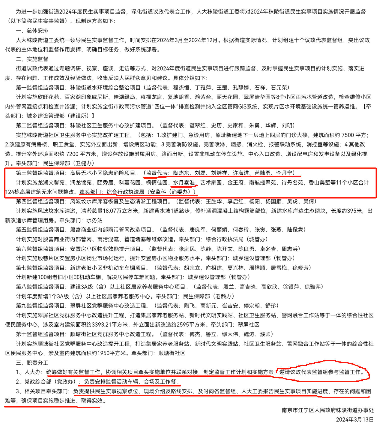 值得一提的是,记者在查询江宁区人民政府官网时发现,2024年3月18日,秣陵街道办事处曾发布《关于2024年度秣陵街道民生实事项目监督方案》,明确街道议政代表对相关民生实事项目进行跟踪监督,及时掌握民生实事项目的计划实施、落实进度、存在问题等事项,收集反映群众意见建议。其中,第三监督组监督项目中提及了高层无水小区隐患消险项目,计划对包含水月秦淮在内的124栋高层建筑无水问题整改,不但明确了6名监督代表,而且还明确了牵头部门为综合行政执法局〔安监科(消委办)〕。但在现有的会议纪要中,牵头的始终是社区,也未在其中见到监督代表的名字。