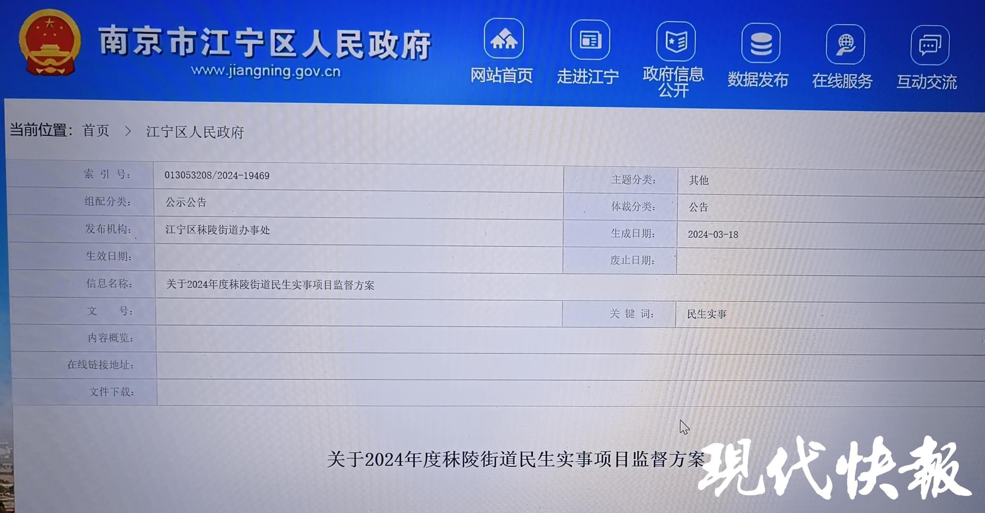 △江宁区人民政府官网可查询到秣陵街道办事处发布的《关于2024年度秣陵街道民生实事项目监督方案》