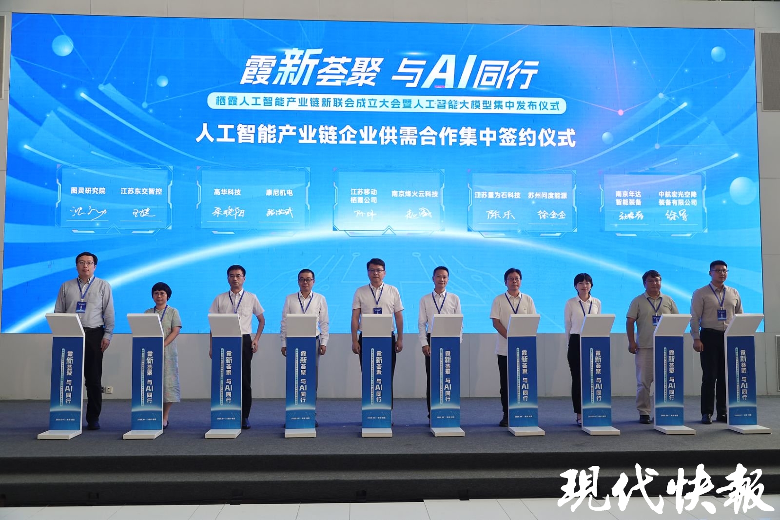 省委统战部副部长徐东海、市委统战部常务副部长黄伟民为栖霞人工智能产业链新联会(区链新会)揭牌。图灵(南京)人工智能研究院总经理沈童刚当选为首任会长。清华大学交叉信息研究院、南京大学栖霞人工智能学院、中国电信人工智能公司、江苏移动等单位的四位人工智能专家受聘为联谊会顾问。图灵(南京)人工智能研究院、南京东交智控、南京高华科技、南京康尼机电、江苏量为石科技、南京年达智能装备等10家人工智能产业链上企业结对签约达成合作。