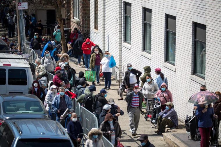 在美国纽约一个食品发放点,人们排队等待领取慈善组织发放的免费食品。