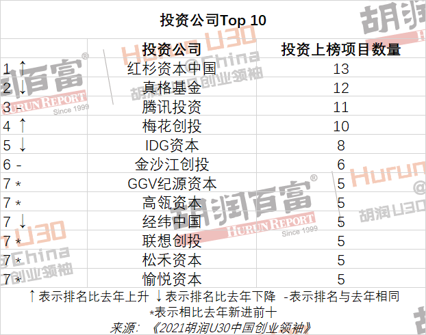 红杉资本中国首次成为上榜项目数量最多的投资公司,去年排名第三,今年共有13家上榜企业是它的投资对象。去年的第一名真格基金今年位列第二,投了12家上榜企业。腾讯投资和去年一样,排名第三,投了11家上榜企业。梅花创投上升两位,排名第四,参与投资10家上榜企业。GGV纪源资本、高瓴资本、联想创投、松禾资本、愉悦资本是前十中的新面孔。
