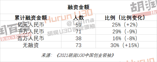 今年的上榜企业融资规模增速明显,平均累计融资4,100万元,去年为2,600万元。累计融资上亿的占25%,比去年增加2个百分点;上千万的占29%,比去年减少9个百分点;上百万的占16%,比去年减少8个百分点;无融资的占30%,比去年增加15个百分点。