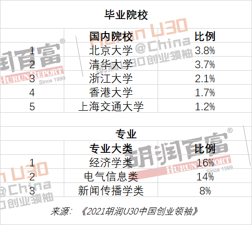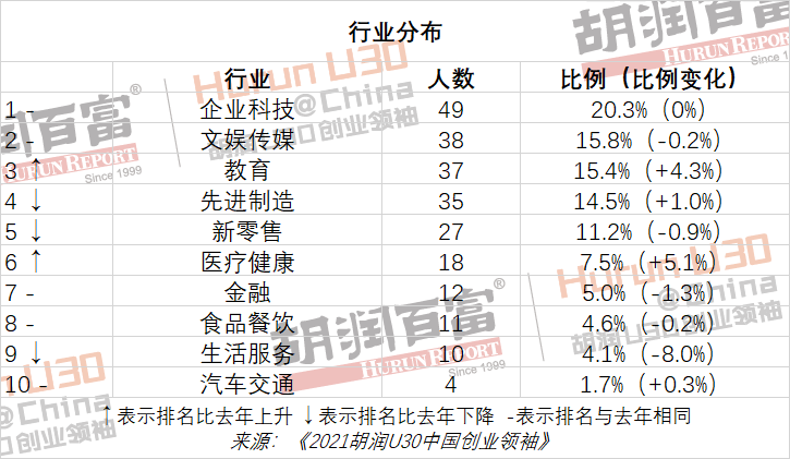 企业科技、文娱传媒和教育成为中国30岁以下创业领袖的前三大财富来源,三大行业上榜人数占全榜单的一半。