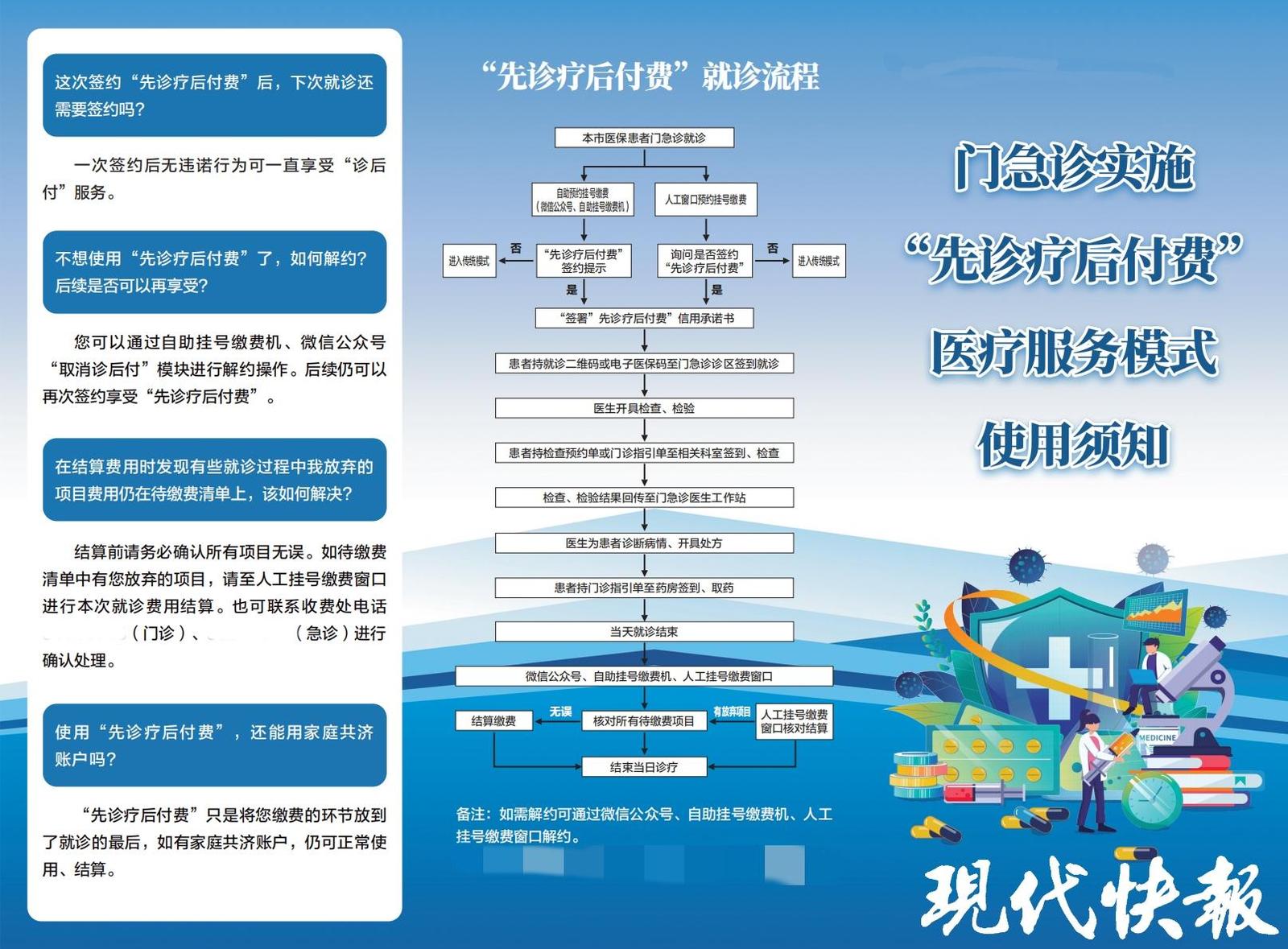在服务流程上,该模式实现了“应简尽简”。患者通过医院微信公众号、人工窗口或自助机挂号后,可自愿签署“信用承诺书”开通服务,且“一次签约全年有效”,本年度内就诊无需重复操作。开通后,患者可直接完成诊查、检查、化验、取药等全流程,中途无需缴费,离院前通过人工窗口、自助缴费机或手机APP即可一次性合并支付所有费用,线上线下均支持医保政策结算。