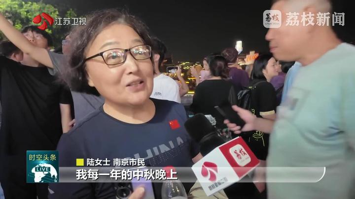荔枝新闻中心记者汤安佶说:“这里是南京夫子庙的文德桥,这里也是自古的赏月佳地,我们可以看到桥上也是人山人海,甚至有一点寸步难行。但是大家看到头顶的这轮明月,看到了这金陵夜景,我觉得今晚也是值得了,这个也是独属于南京的浪漫和诗意。”