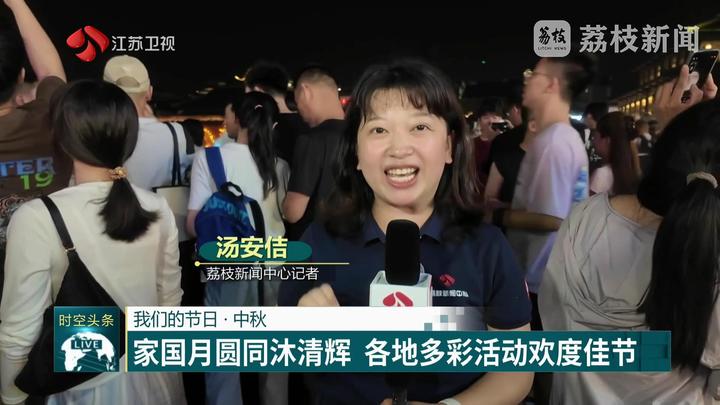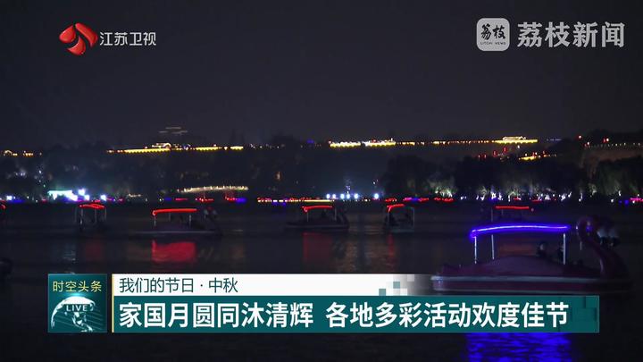 荔枝新闻中心记者杨尔希说:“这里是南京的玄武湖景区,风清气朗,中秋月圆。这里迎来了不少前来游湖赏月的市民和游客。”