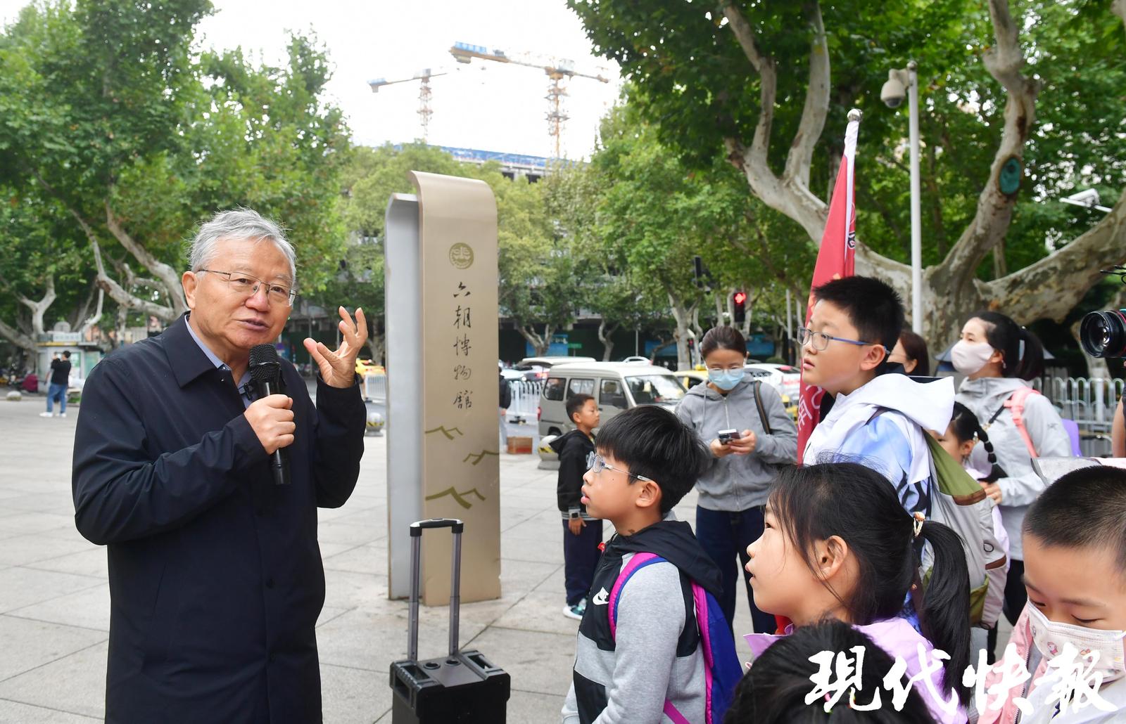 在六朝博物馆门前,薛冰讲述东箭道跑小火车的故事