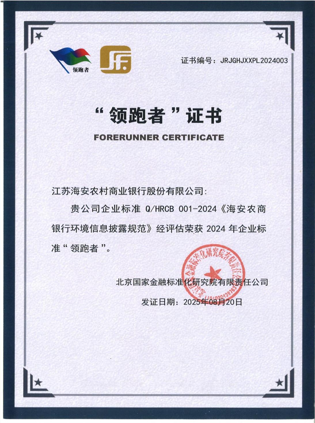 为促进金融领域企业标准化发展,在国家市场监督管理总局统筹下,中国人民银行、国家金融监督管理总局、中国证券监督管理委员会共同组织开展了2024年度金融领域企业标准“领跑者”活动。活动期间,全国范围内共有2815家企业参与,提交参评标准达3167项,经评审共产生“领跑者”182家。其中,海安农商银行自主研制的Q/HRCB001-2024《海安农商银行环境信息披露规范》凭借高水准的标准化设计与实践成效,成功入选,成为全国首批获此殊荣的金融机构,标志着该行在绿色金融标准化建设、环境风险管理领域跻身全国同业前列。