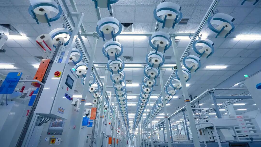 走进车间,昔日“机器轰鸣、工人穿梭”的景象早已不见,取而代之的是高速运转的数字化设备,机械臂精准完成络筒、并线的无缝衔接,AGV小车往来穿梭运送物料。