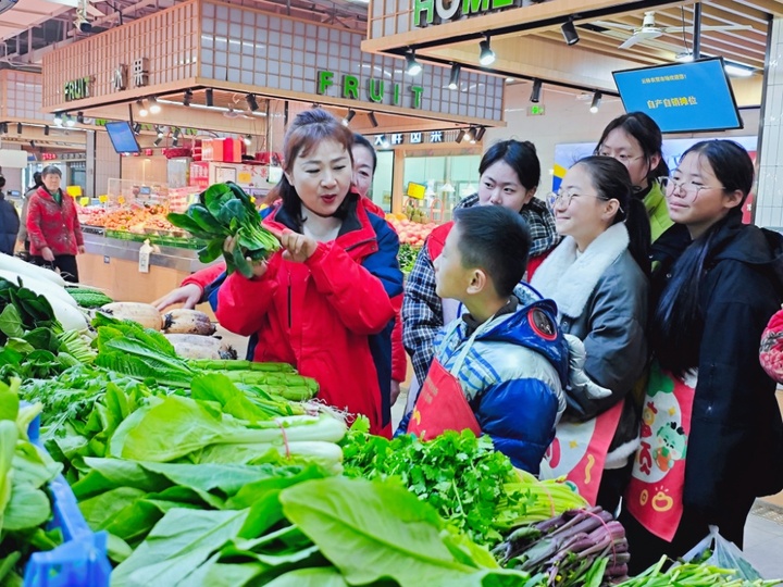 在志愿者的带领下,孩子们被分成小组,挎上小菜篮,走进热闹的市场采购食材,并学习蔬菜价格计算方法。“阿姨,我要两斤夹心肉,做肉塞面筋用!”黄天航学着妈妈的样子讨价还价,肉铺摊主笑着给了他一块新鲜的肉;张嘉靓在蔬菜摊前认真挑选菠菜和豆芽,“老师说这是如意菜,吃了事事如意”。胡琦瑛说,为了让孩子们学得地道,市场特意协调商户提供新鲜食材,“这些年菜都是无锡人年夜饭的必备菜,既能让孩子体验劳动,又能感受本地年味”。