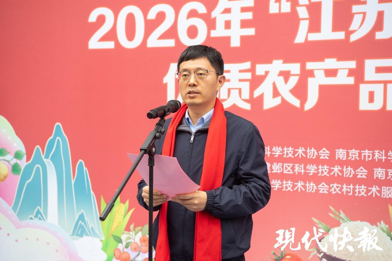 省科协党组成员、副主席夏军、南京市科协一级调研员许光明和建邺区委常委、副区长卫明月共同为2026年“江苏省科技小院”优质农产品年货大集开街。