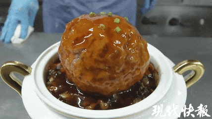 选肉、切配、打泥……十三年,这套动作重复了无数遍。“选肉必须是三七肥瘦五花,肥三分增香润口,瘦七分保证扎实口感,比例差一点,口感就差一大截。”主厨郭飞说。从手工打泥、鸭蛋调和,到文火炖足三小时,每一步都容不得马虎。打泥要反复揉搓至肉质起胶,炖制要精准控火,只为守住那一口恰到好处的软糯鲜香。同事曾劝他用现成肉糜省力,他却摇头说:“机器绞的,纤维断了,‘魂’就没了。”火苗轻舔锅底,汤面只冒细泡,三小时煨炖里,郭师傅一直守在灶边。