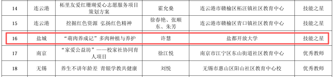 近日,2025年江苏省社区教育、老年教育“能者为师”教学技能展示活动评审结果公布,盐都开放大学教师许慧荣获类别三——社区教育、老年教育项目策划能力展示“技能之星”奖项。