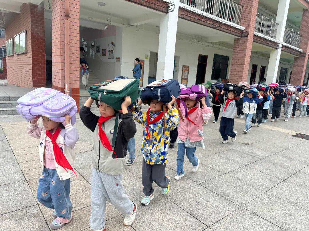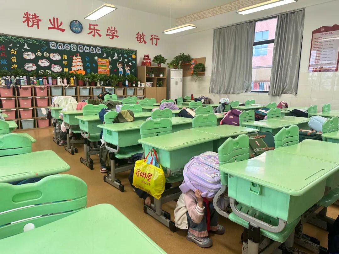 地震演练环节,随着警报声响起,各班老师迅速引导学生躲至课桌下方,双手抱头保护头颈;疏散阶段,师生用书包护头,途经烟尘区用织物捂口鼻,全程遵守“不推挤、不滞留,不超速”的纪律要求。从避险准备到紧急疏散,各环节紧密衔接、规范有序,全体师生以高度的专注力投入演练,切实将安全防护知识转化为实战能力。
