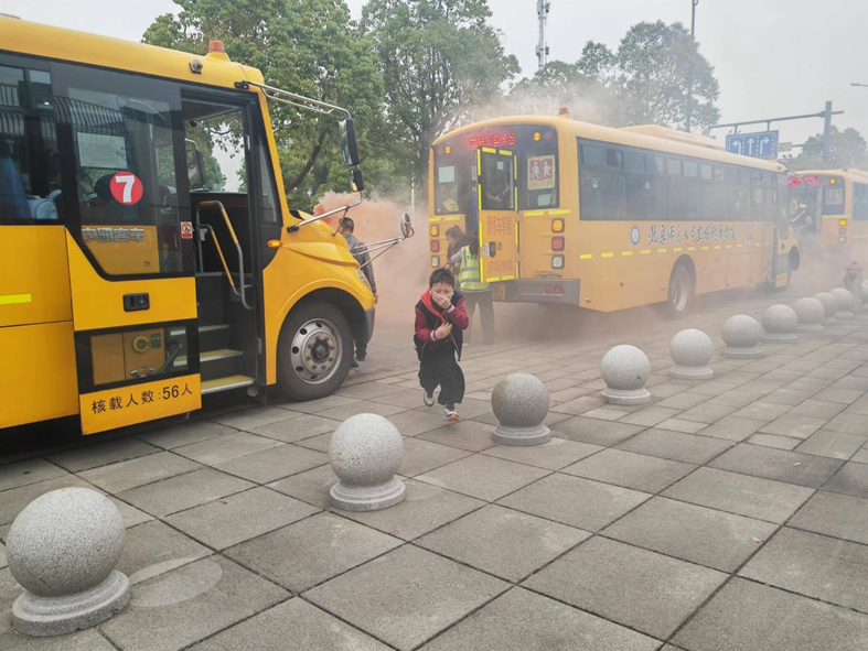 模拟应急疏散环节,随着“校车突发火情”信号发出,各校车驾驶员迅速停车、开启应急灯,照管员第一时间下达“弯腰、捂口鼻、有序疏散”的指令,引导学生沿着车门两侧的安全通道快速撤离至指定的安全区域。整个疏散过程快速高效,不仅让学生在实践中掌握应急疏散的技能,更强化了学校与校车公司的协同配合能力,进一步完善了校园交通安全应急管理机制。