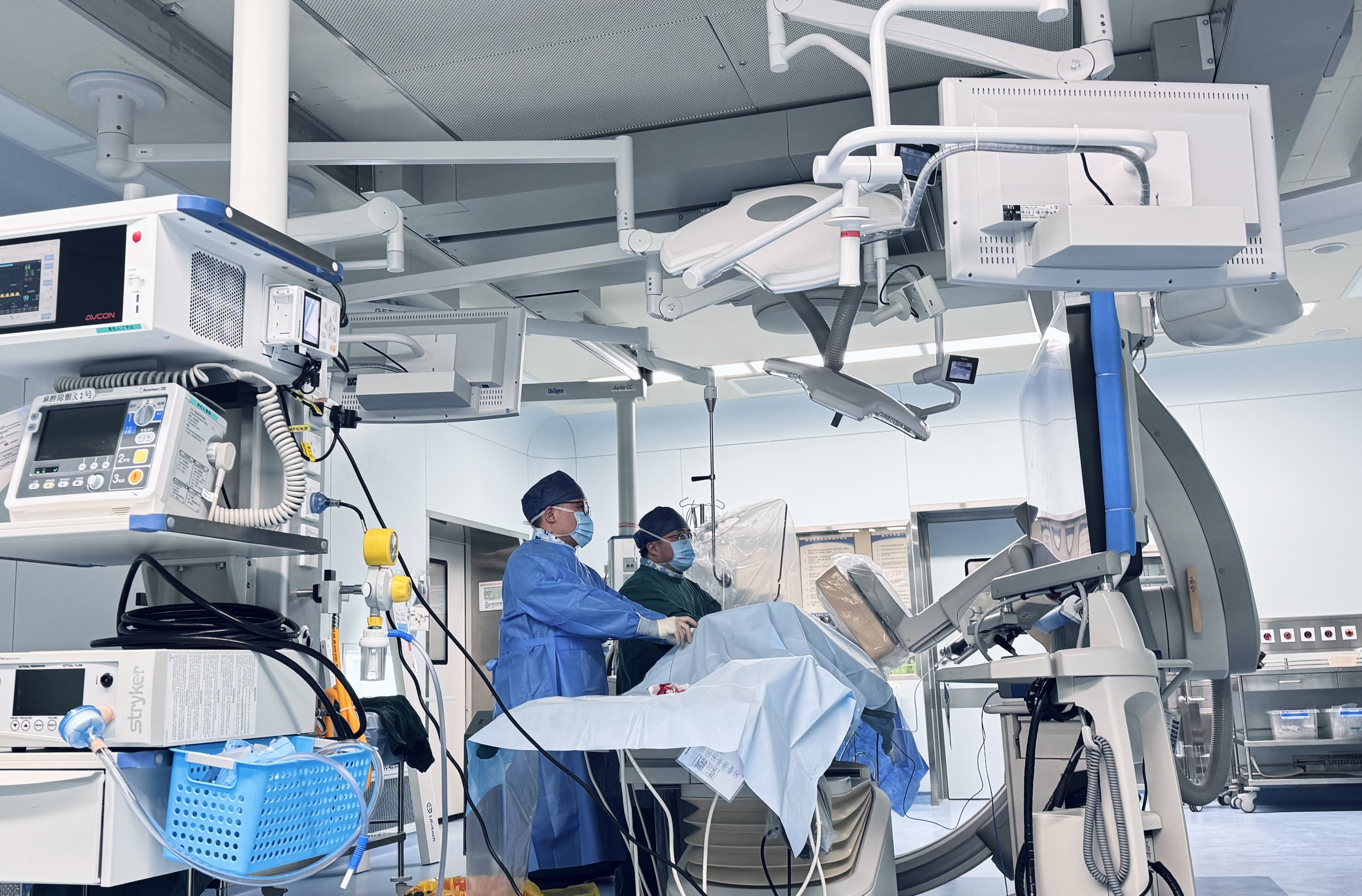 经两周的保守治疗,许女士情况适当稳定后,尤庆生团队将手术“战场”设在通大附院的“杂交手术室”中。他介绍:“‘杂交手术室’也称为复合手术室,可同时进行外科手术、介入治疗和影像学检查,既能解决高危心脏大血管疾病、复杂冠心病、先天性心脏病以及血管外科疾病,又适用于神经医学的复合手术,实现微创手术。与开胸手术相结合,对可能出现的并发症及时处理,为手术提供更强大的技术保障。”