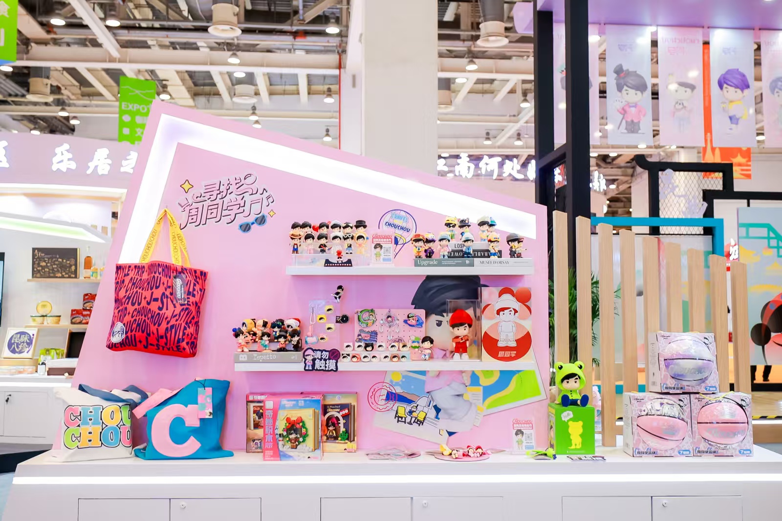 在展会内容方面,巨星传奇通过“室内展馆+户外市集”双线联动的模式,系统展示其IP产品矩阵。室内展区集中呈现了包括自营及授权潮玩、上海网球大师赛联名系列、CHOUCHOU黑标产品线,以及上海博物馆联名文创在内的多维度IP衍生品。