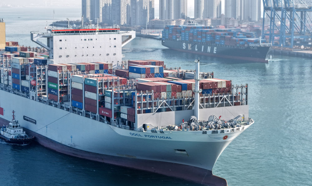 △2025年12月4日,货轮进出山东港口青岛港前湾港区(无人机照片)。新华社记者 李紫恒 摄