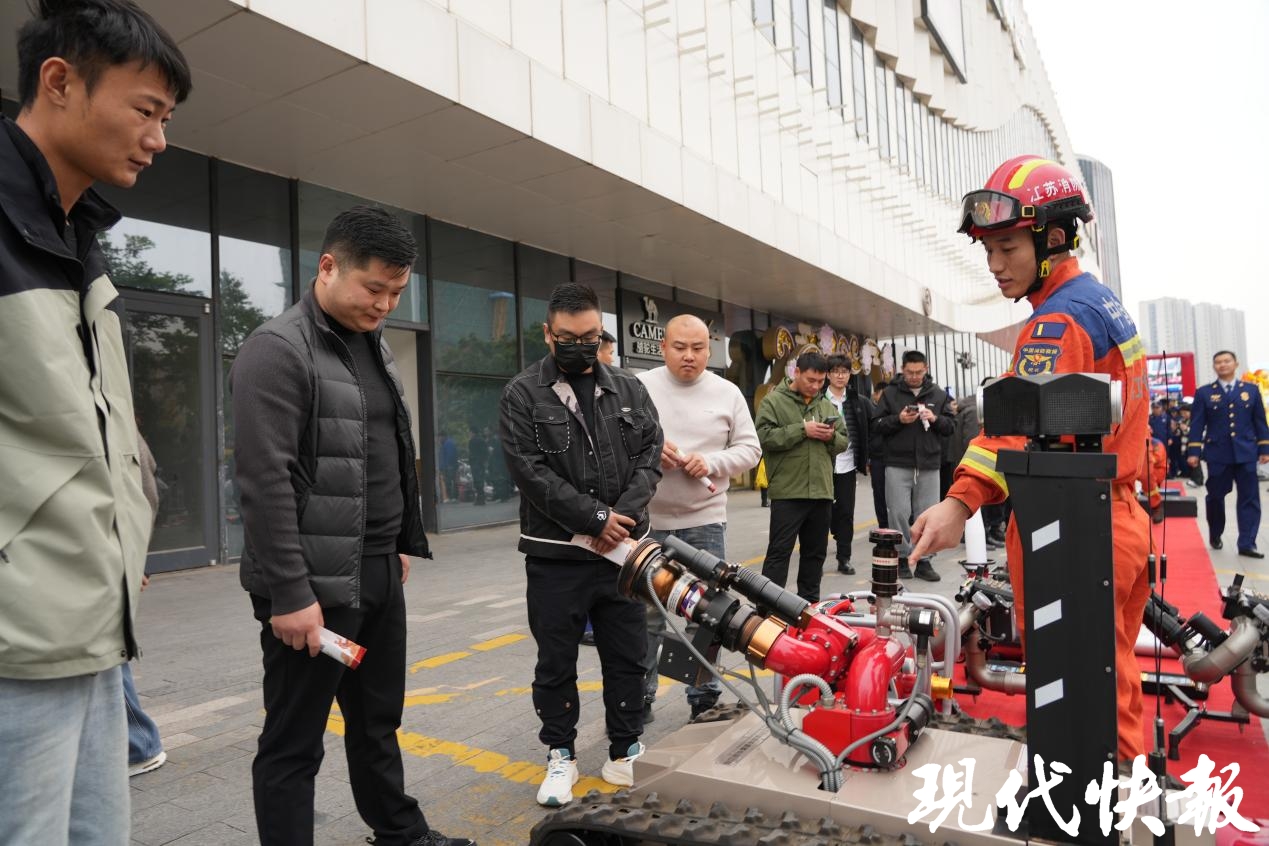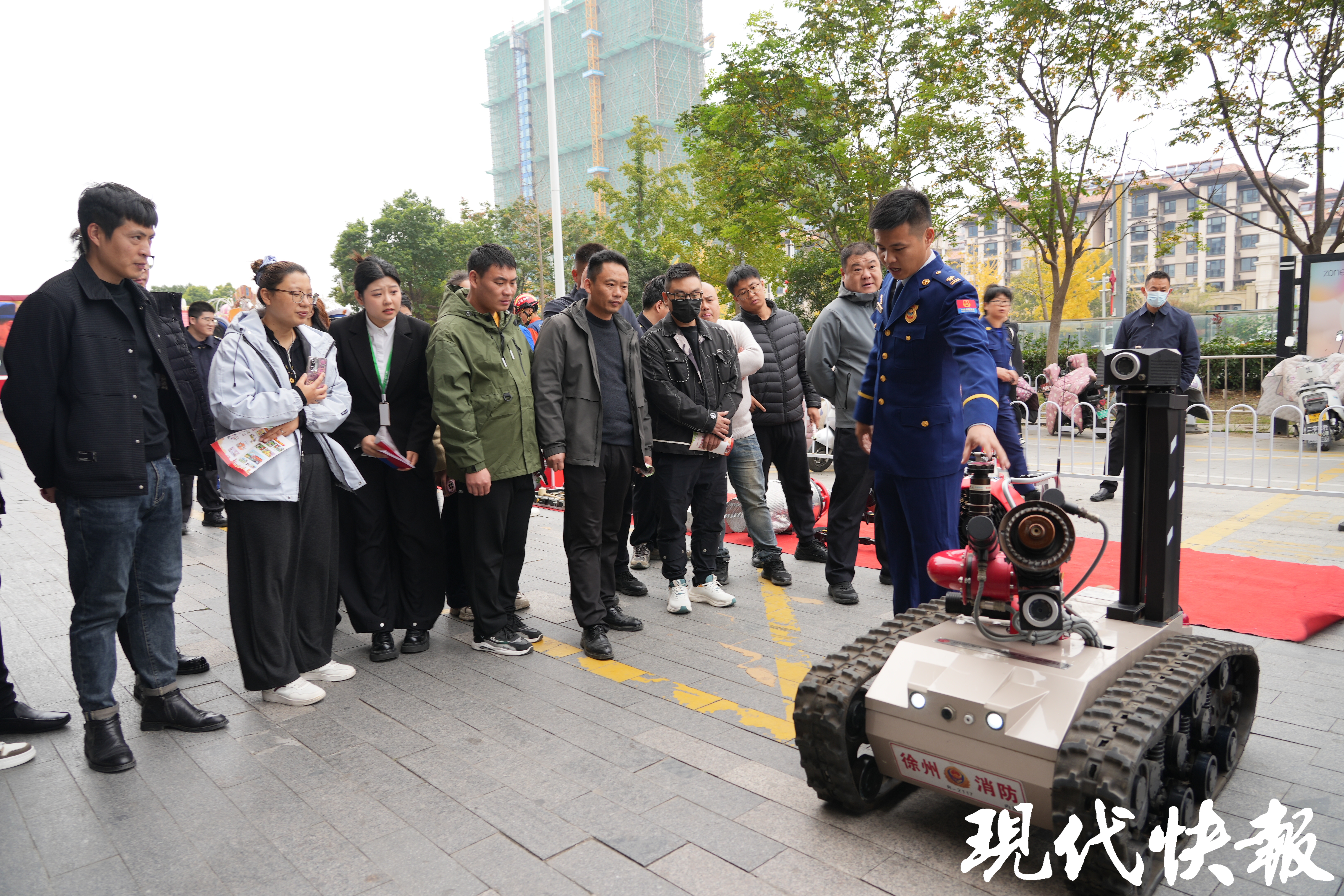 仪式结束后,外场展示环节成为焦点——消防展台陈列了化工处置器材、消防机器人、破拆工具等先进装备,吸引市民驻足了解。现场进行的防盗窗破拆演示和无人机穿越表演将气氛推向高潮,观众掌声不断。此外,消防主题文创产品、安全知识展板等也通过互动方式,让市民在体验中学习防火技能。