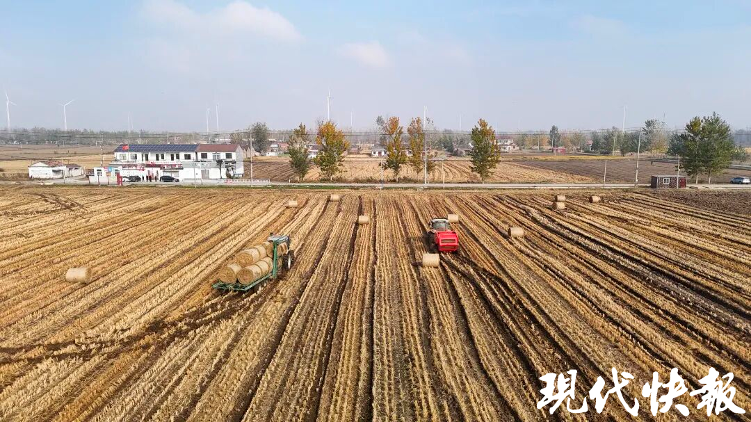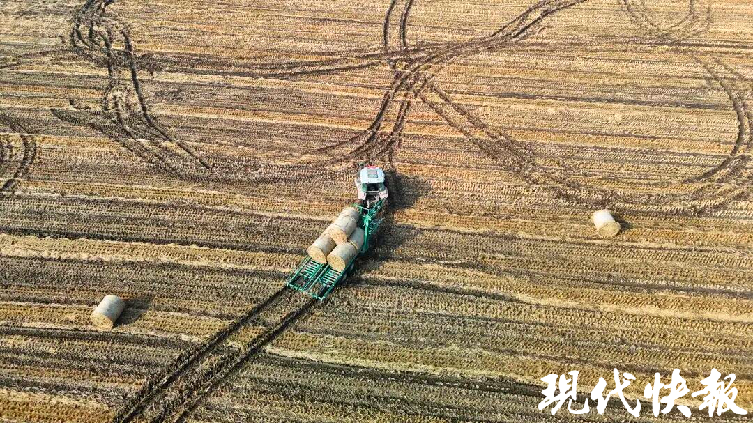 近日,在睢宁县梁集镇李圩村一处收割完毕的稻田中,秸秆打捆机来回穿梭,将散落的稻秸迅速压实、打捆,形成一个个整齐的方捆。紧随其后的自动捡拾机高效运作,将草捆稳稳抓起、装车,一系列工序流畅而高效。