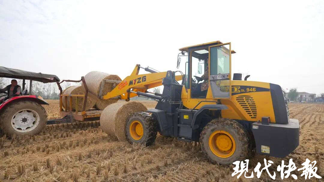 打捆机来回作业,一个个圆滚滚、金灿灿的草垛在田地里十分醒目。由于田地潮湿,重型车辆难以入田。叉车、拖拉机、运输车协作作业,将秸秆从田地运至收储堆放点。