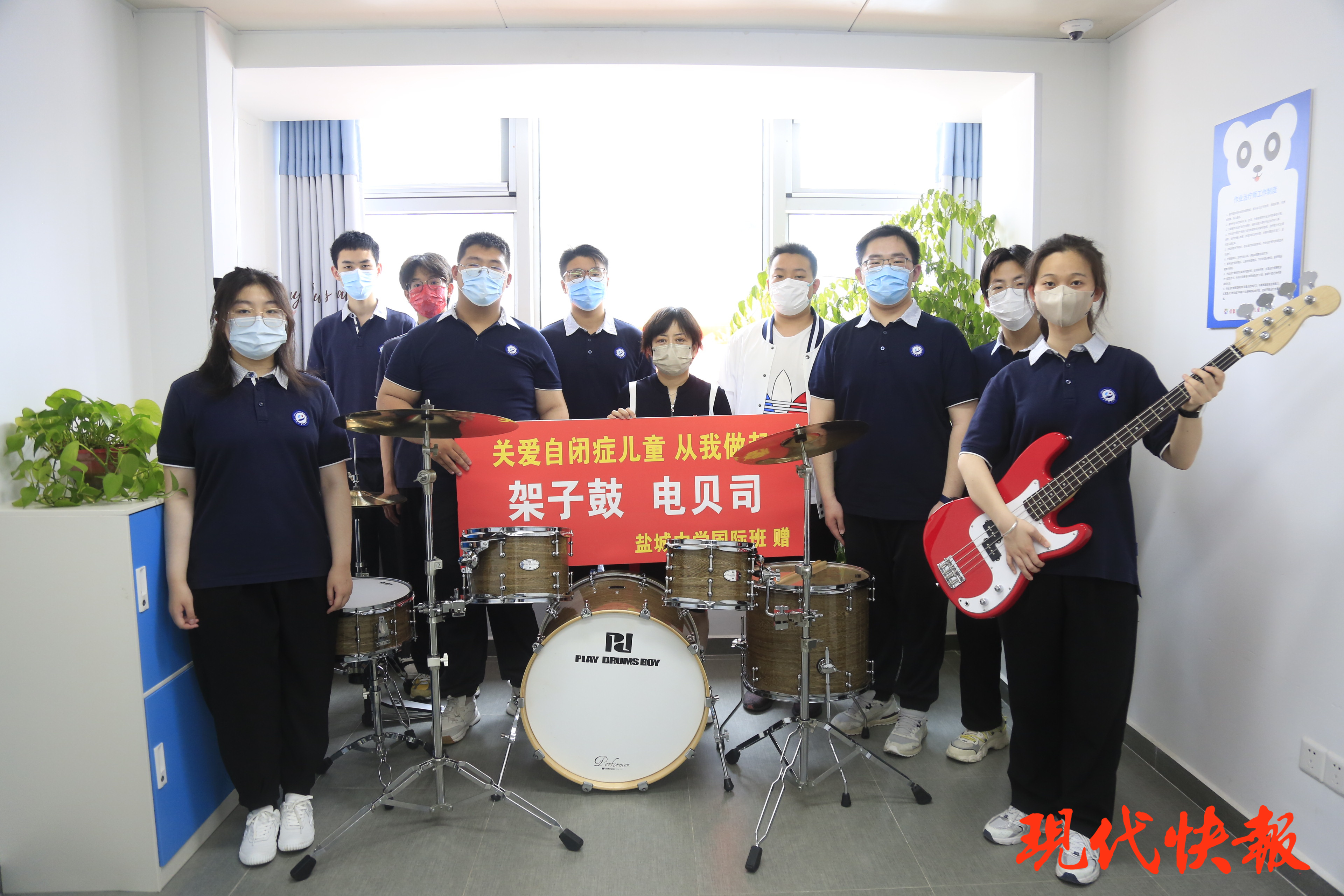 活动一开始,盐城中学国际班高三年级的祁闻、杨耀、陆星宇、杨可欣、孙梓清、赵士阳、孟繁宇、沈司翰、商炜健9名中学生向儿童康复院区捐赠价值15000元架子鼓、电贝司。德馨医院儿童康复中心主任金玲感动地说:“我们将在这次捐赠的架子鼓、电贝斯乐器基础上,连同此前接受捐赠的钢琴、电钢、古筝等乐器,组建自闭症儿童自己的星星乐队,到时再邀请大家前来观看星星乐队的汇报演出。”