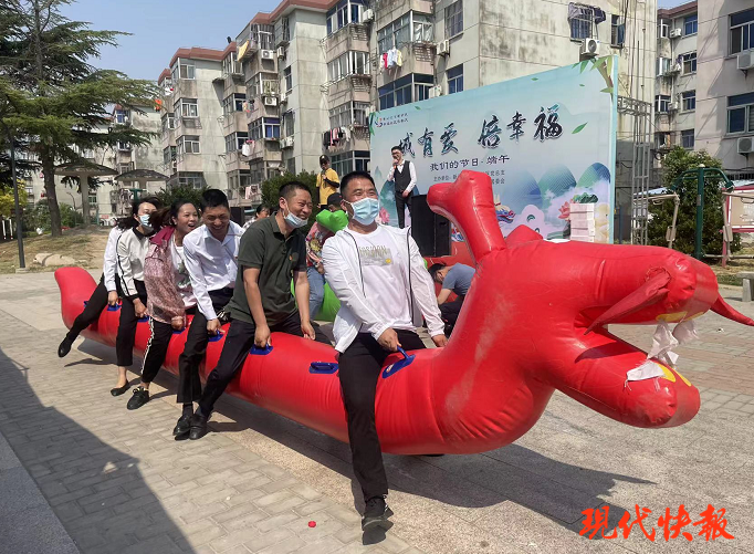 当天上午,新洋街道城北新村的文化广场上,一场别开生面的旱地龙舟赛正在激烈举行。参赛队员们骑坐在充气“龙舟”上,以脚为“桨”,快速向前“划”行,这是一场速度与默契相融合的比赛。在一片欢呼声中,赛道上的彩色卡通龙舟快速向前“划”行。现场观看比赛的观众激动地高呼“加油、加油!”活动现场气氛紧张而热烈。