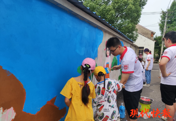 “破冰”活动,拉近心的距离。活动伊始,团队成员与儿童一起进行“破冰”活动,如“拔河比赛”“你画我猜”、团体跳绳等团体游戏。活动中,孩子们的欢声笑语几乎响彻整个村子。倾听心声,激发手绘灵感。团队成员积极与当地儿童交流互动,充分了解孩子们的兴趣爱好,在交流中激发孩子们的手绘灵感和创作热情。墙绘活动正式开始后,孩子们在团队成员的指导下,自在快乐地用七彩画笔在白墙上勾勒出自己眼中的美丽乡村,充分认识美、感受美、欣赏美、创造美。